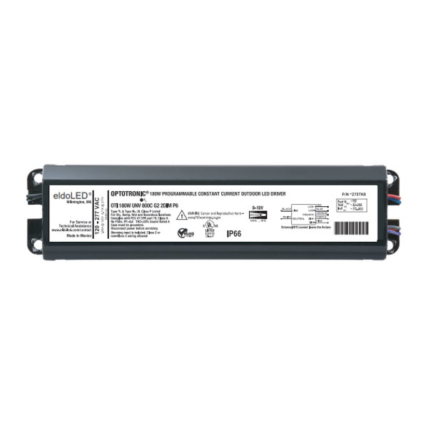 The OPTOTRONIC 180W programmable constant current LED drivers provide flexible input voltage options and wide output current ranges (175 to 1800mA), tailored to the design and mounting heights of roadway, street, area, parking and high-bay industrial luminaires. The OPTOTRONIC 180W LED drivers support smooth, flicker-safe dimming to 10%, electronic dim to off, and 0-10V, DALI-2 and D4i lighting control, and deliver superior surge protection and power quality immunity.