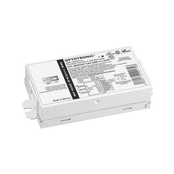 The OPTOTRONIC® 25W indoor compact programmable LED drivers are exclusive to North America. All of these highly efficient constant current drivers dim to 1% with unique architectural grade features—such as Dim to Off, Vaux Output and Synchronized ON/OFF Timing—to meet the tough demands of your lighting projects. Our 25W compact LED drivers’ programmable output current range (150-1250mA)—coupled with their universal input voltage range (120-277V or 347V)—provides you with a highly efficient and flexible drive solution for indoor lighting. Perfect for downlights, in-grade fixtures, recessed troffer and wall wash lighting for your office and retail applications.