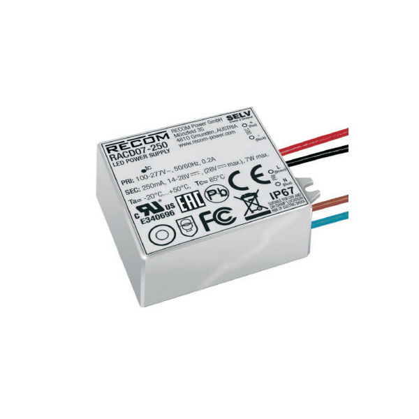 The RACD07 is a constant current 7W AC/DC source for LED lighting with a wide input voltage range. The LED drivers are available with constant current outputs of 250mA, 350mA, 500mA or 680mA. The series is IP67 rated and suitable for use in dry, damp or wet areas. RACD07 drivers have a 3 year warranty.