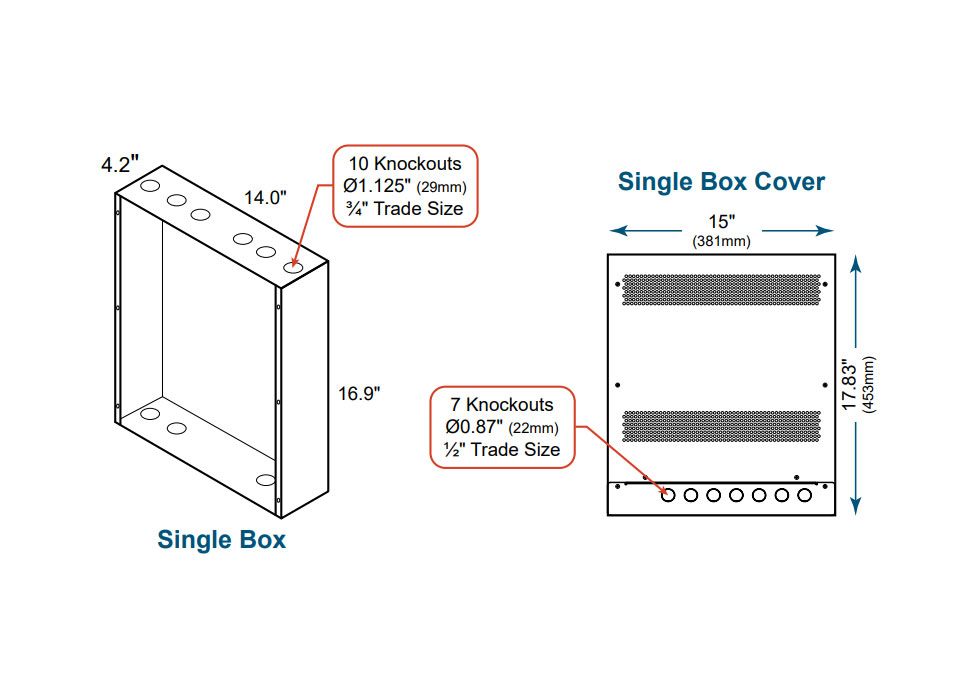 Multiple 1-1/8" (3/4" trade size) knockouts and seven 0.87" (1/2" trade size) knockouts on cover