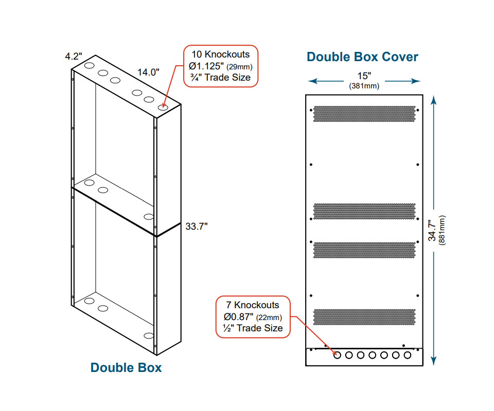 Multiple 1-1/8" (3/4" trade size) knockouts and seven 0.87" (1/2" trade size) knockouts on cover