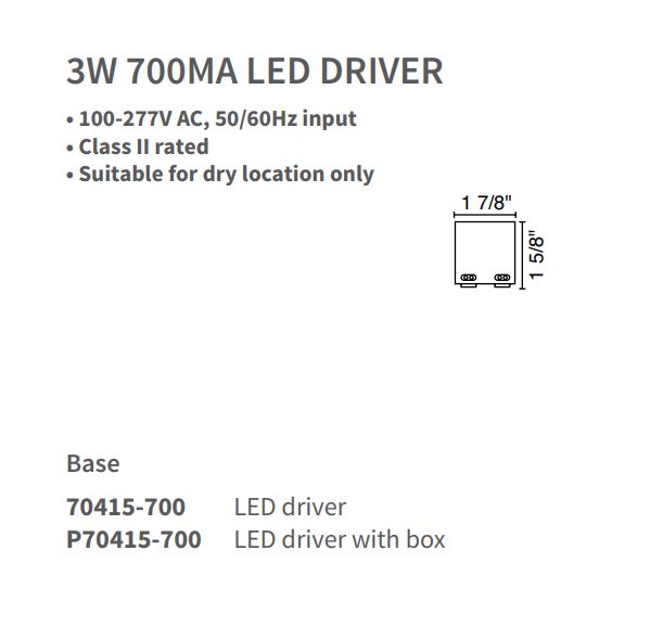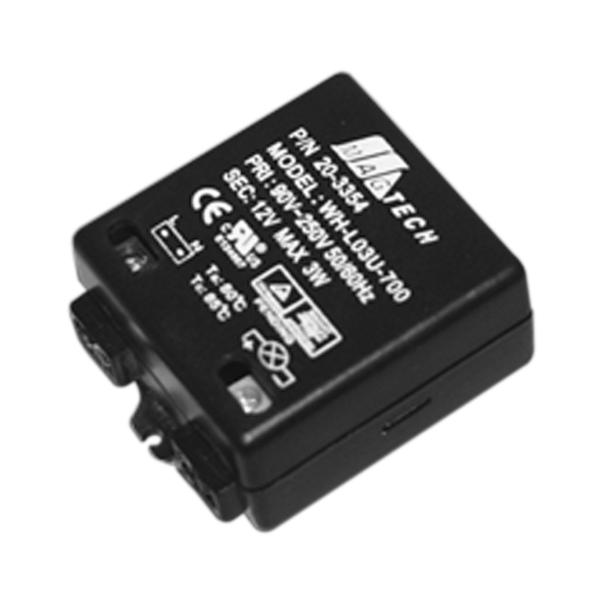 The 3-watt driver is a Class II power supply rated for operating LEDs. It features a universal voltage input and a constant current output. The inherent protection adds reliability to both the driver and the LEDs connected. To avoid damage to LEDs, the number of fixtures connected must be within the range limits listed for the driver and be wired in series.