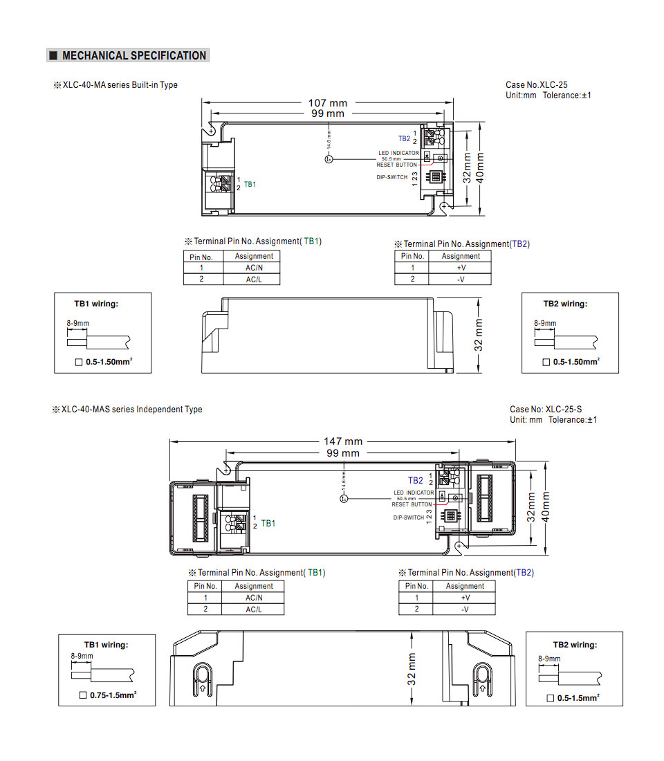 XLC-40-MA series is a 40W with constant power output LED driver. It can operate from 100-305V AC and output current ranging between 600mA to 1400mA selectable by dip switch. Thanks to high efficiency up to 88%, it is able to operate for -25ºC~90ºC case temperature under free air convection. XLC-40-MA series is designed based on latest safety regulations with Matter wireless dimming. It provides more flexibility for LED lighting application.
