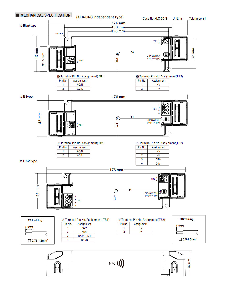 • Constant power mode output with multiple stage selectable by dip switch NFC setting (H-type)
