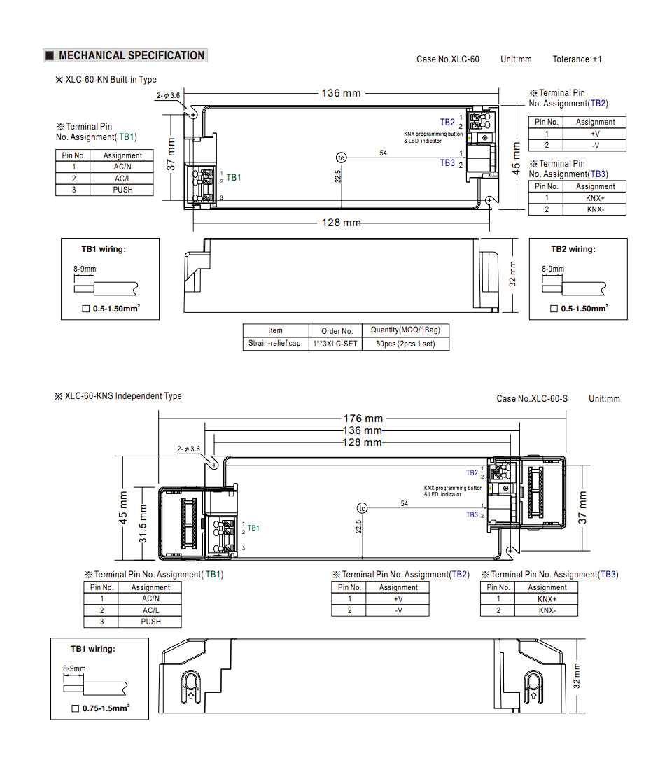 XLC-60-KN series is a 60W with constant power output LED driver. It can operate from 100-305V AC and output current ranging between 900mA to 1700mA selectable by ETS database. The integrated KNX interface avoids using the complicated KNX-DALI gateway. Thanks to high efficiency up to 90%, it is able to operate for -25ºC~90ºC case temperature under free air convection. XLC-60-KN series is designed based on latest safety regulations, and provides more flexibility for LED lighting application.